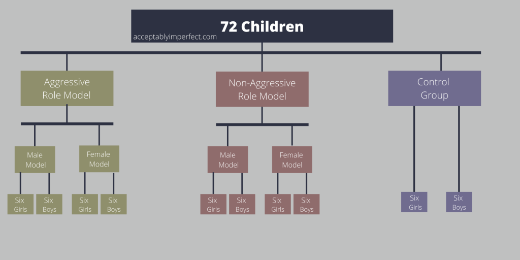 Using a matched-pairs design, 72 children were sorted into three groups for this study (see chart below). The first group of 24 children saw an adult aggressively hitting an inflatable clown doll known as a Bobo doll. The second group witnessed an adult playing quietly, ignoring the bobo doll. The third group of children did not watch an adult as part of the study.