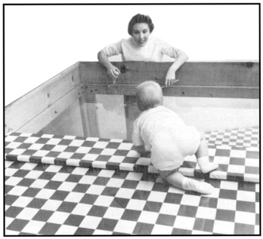 Are babies born with the fear of heights? Gibson and Walk wanted to find out! In 1970 they created a visual cliff by placing a piece of transparent plexiglass over a checkered cloth. At the halfway point, the cloth drops down creating a visual cliff (depicted below).